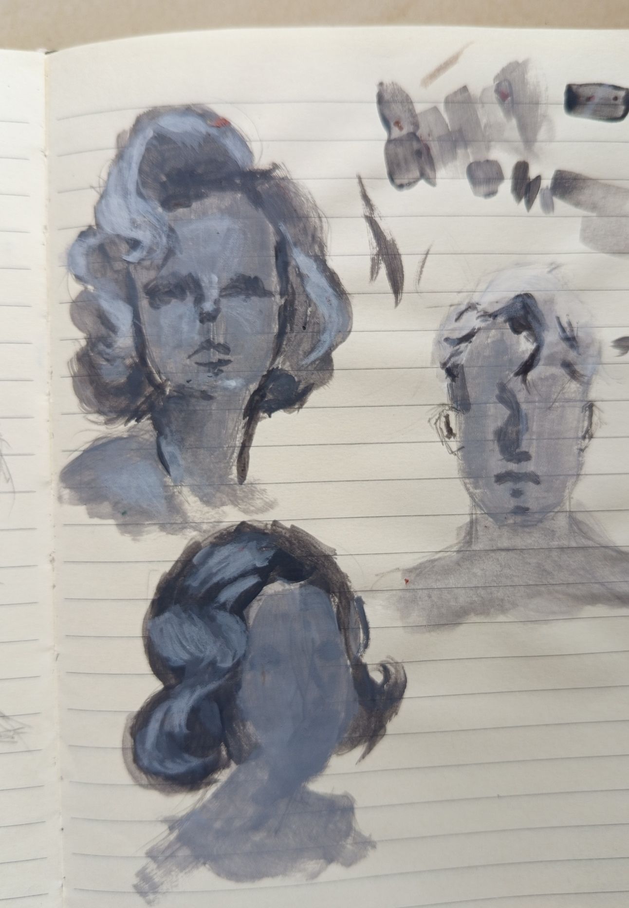 Sketching out the shape of the head and hair, adding guidelines, mixing the paint and painting with a medium size brush.