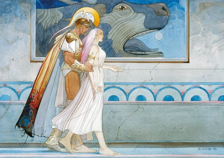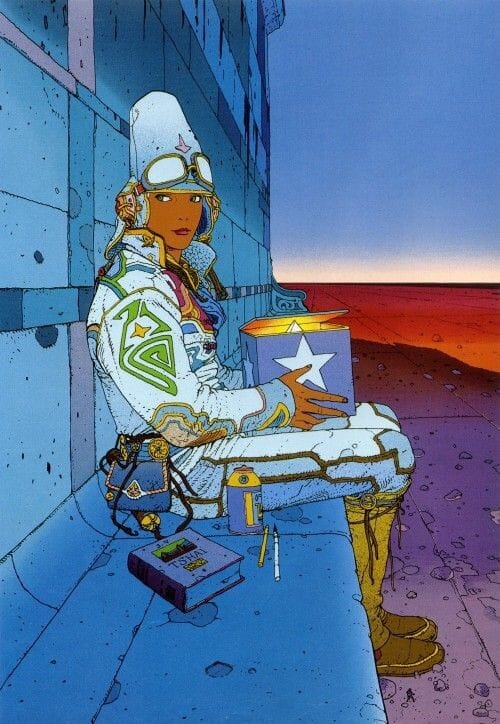 This week, I discovered a painting... And was amazed by everything on it ! It was painted by Jean Giraud aka Mœbius, a legendary french comic Artist. He is the creator of **Blueberry, À la recherche du temps** and other. His paintings are... Particular in their own ways. Vast orangish deserts with translucide crystal rocks rising to the blue sky, his characters contemplating the view, are like swallowed by the landscape. A balanced use of complementary colors. Stories set sometimes in a far future in space, sometimes in antique Greece, sometimes in the far West. It's striking without being offensive, it's vivid without being loud and it's telling stories without info dumping.